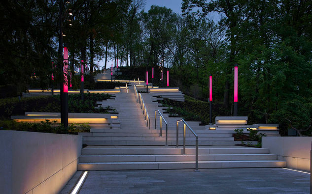 The primary goal of the proposed Art Climb is to be an extension of the Cincinnati Art Museum into the landscape—an outdoor gallery for artwork in a variety of media. Additionally, it is meant to be a welcoming gesture to the residents from the adjacent neighborhoods to visit the museum and a space to encourage physical fitness. The Art Climb consists of monumental stairs leading to a series of terraces containing artwork and benches for relaxation. The forms of the stairs and walls were inspired by the limestone outcroppings found throughout the region. Special lighting creates a dynamic and artful nighttime experience.