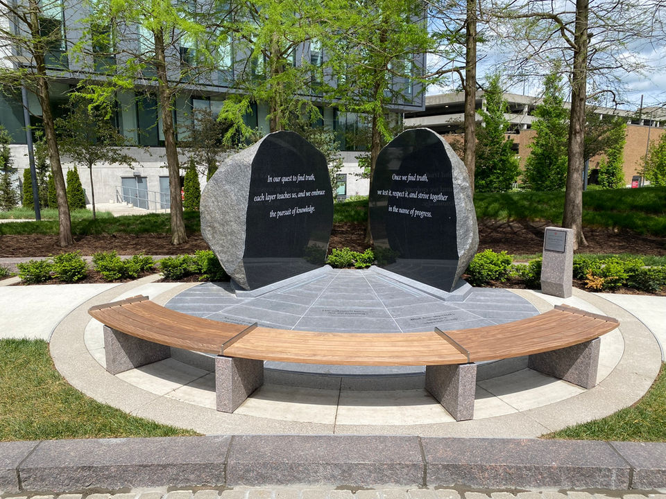 The Rock of Truth is situated within a campus environment and blends harmoniously with existing paths and plantings through use of similar material and colors while standing out as an impactful art feature. The project is a welcoming place for students and campus visitors to reflect and appreciate the campus green.